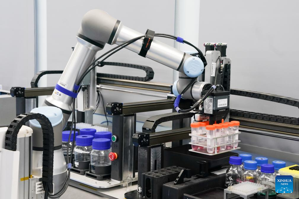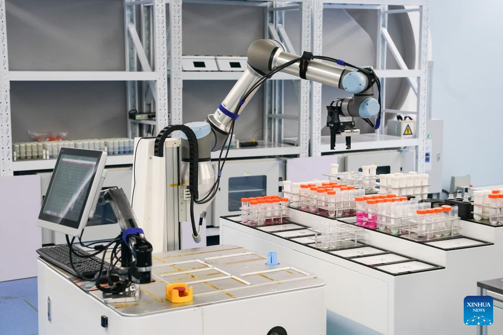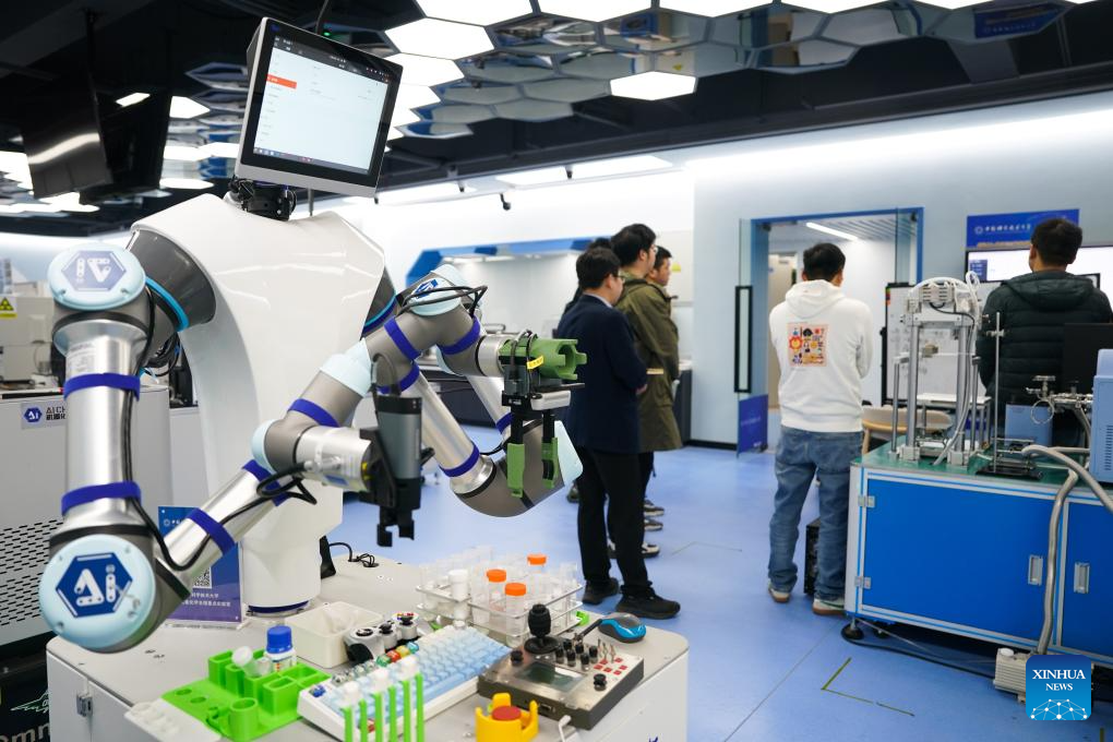 Robot Xiaolai performs an experiment at the state key laboratory of precision and intelligent chemistry of the University of Science and Technology of China (USTC) in Hefei, east China's Anhui Province, Nov. 24, 2025. Traditional chemical research has long relied on continuous trial and error by scientists. With the development of artificial intelligence and robotic automation technologies, it has become possible to design experiments and issue instructions through intelligent platforms, using robots to replace human labor in experiential operations, which enhances experimental efficiency and precision.