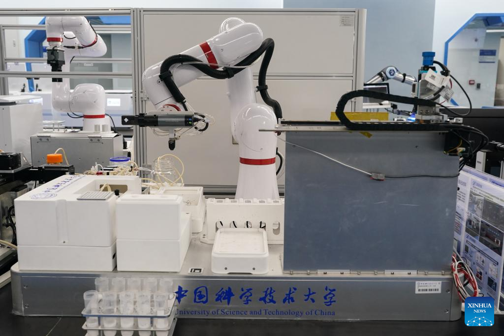 Robot Xiaolin is pictured at the state key laboratory of precision and intelligent chemistry of the University of Science and Technology of China (USTC) in Hefei, east China's Anhui Province, Nov. 24, 2025. Traditional chemical research has long relied on continuous trial and error by scientists. With the development of artificial intelligence and robotic automation technologies, it has become possible to design experiments and issue instructions through intelligent platforms, using robots to replace human labor in experiential operations, which enhances experimental efficiency and precision.